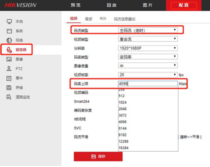 根據網頁訪問攝像機調節途徑,配備-音頻視頻-視頻,挑選碼率種類,設定相匹配的視頻碼率限制標值。
